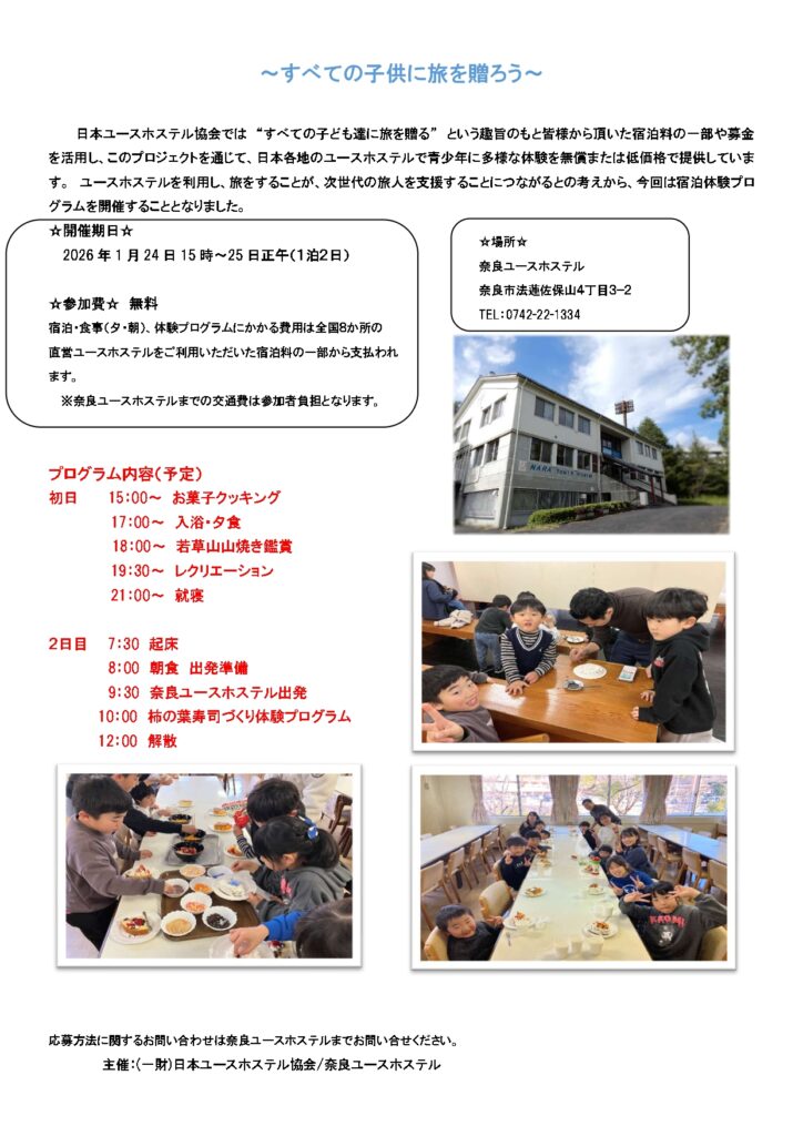 本プロジェクトを通して、子どもたちに「旅」というかけがえのない体験を届けられるよう、今後も日本ユースホステル協会は取り組みを進めてまいります。